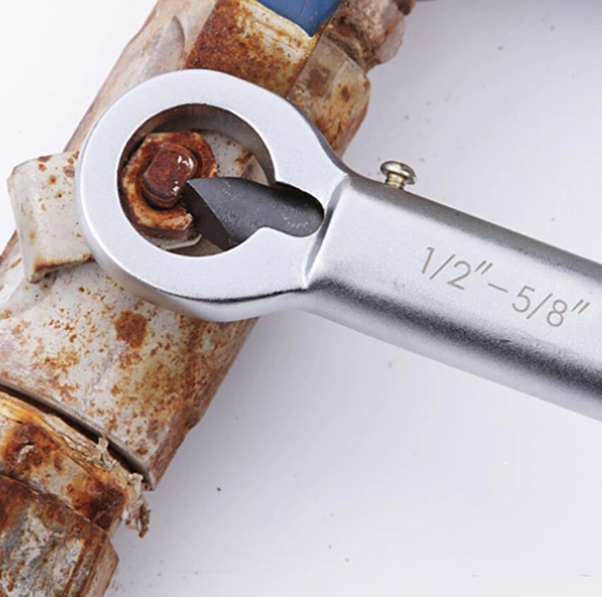 Бывает гайка настолько прикипит или приржавеет, что невозможно ее открутить. Уже все сорваны грани у гайки, а она все не откручивается. Гайколом гайкорез позволяет вам без усилий разрушить гайку не повреждая резьбы на которую она накручена. Гайколом гайкорез накидывается на гайку, а на его хвостовике вращаем ключом толкающий болт. Гайка под усилием клина разрушается. Гайколом гайкорез смотреть здесь