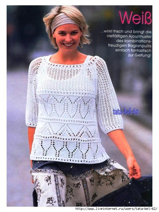Всем привет! Сегодня для вас добавлю в копилочку прекрасные ажурные джемперы на лето в белом цвете. В этом цвете любой ажурный узор смотрится прекрасно! Поэтому все модели которые мне попадаются белого цвета мне хочется сохранить и показать вам. Все эти джемперы подойдут на любой размер. Напишите в комментарии какая модель понравилась вам. Модель №1 Шикарный летний джемпер с ажурными узорами. Такой лучше носить с топом так как он очень ажурный. Но также можно заменить верх переда на более плотный узор и тогда можно носить без топа. Такой летний джемпер выглядит очень красиво и нарядно.