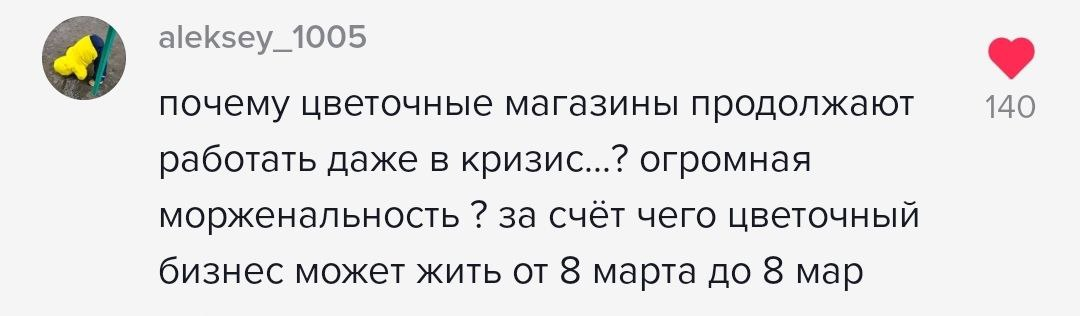 ❓Вопрос подписчика ❓ Обзорная экскурсия. Цветочный бизнес живёт не только на 8-ое марта. Мой магазин ни одного месяца не был в убытках. (update: с данным магазином и бизнесом в России не связан! Развиваю другие направления в другой стране) Магазин всегда (был) прибыльный. И в Ноябре, и в Июле, и в Декабре цветы продаются одинаково. 8 магазинов, 7 конкурентов в радиусе 200 метров. По поводу кризиса и короновируса. Во-первых, процветали и выжили не все. Я в момент старта пандемии был наёмным маркетологом сети премиальных цветочных. Когда торговлю закрыли, людей убрали на удалёнку, рассадили по домам, цветочная сеть стала торговать больше, чем до пандемии (!). Почему? 6 из 10 цветочных магазинов не имели сбыта через интернет, курьерской системы, стабильного инстаграма, не работали с агрегаторами. У нас всё работало и до пандемии. Людей закрыли дома, а дни рождения, праздники никто не отменял. Попробуй жене в ДР не подарить букет из-за какой-то там смертельной пандемии, ага. По итогу огром
