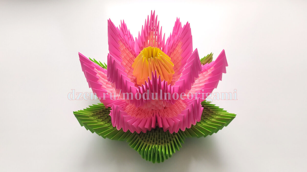 Здравствуйте, Друзья! На последних занятиях мы с вами научились собирать змейку, паука, царевну-лягушку, бабочку. Сегодня будем собирать прекрасный цветок ЛОТОС. Список мастер классов. Наберемся терпения и заготовим 1250 модулей: 480 зеленых, 522 розовых, 176 малиновых, 72 желтых. Как собирать треугольные модули, можно посмотреть здесь. Для вашего лотоса можете выбрать цвета на свое усмотрение. Наш лотос будет состоять из 4 уровней. Начнем с первого нижнего уровня. Все модули на этом уровне будут зеленые. Одновременно собираем первый, второй и третий ряды. В каждом ряду собираем по 30 модулей, в конце замыкаем в кольцо. Первый ряд собирается короткой стороной вперед, остальные ряды длинной стороной вперед. В четвертом ряду увеличиваем количество модулей до 60, надевая на каждый модуль третьего ряда по 2 модуля внутренними кармашками. Пятый ряд 60 модулей. В шестом ряду пропускаем каждый десятый модуль и собираем 54 модуля. С седьмого ряда начинаем собирать лепестки: 8 модулей, 7, 6, 5,