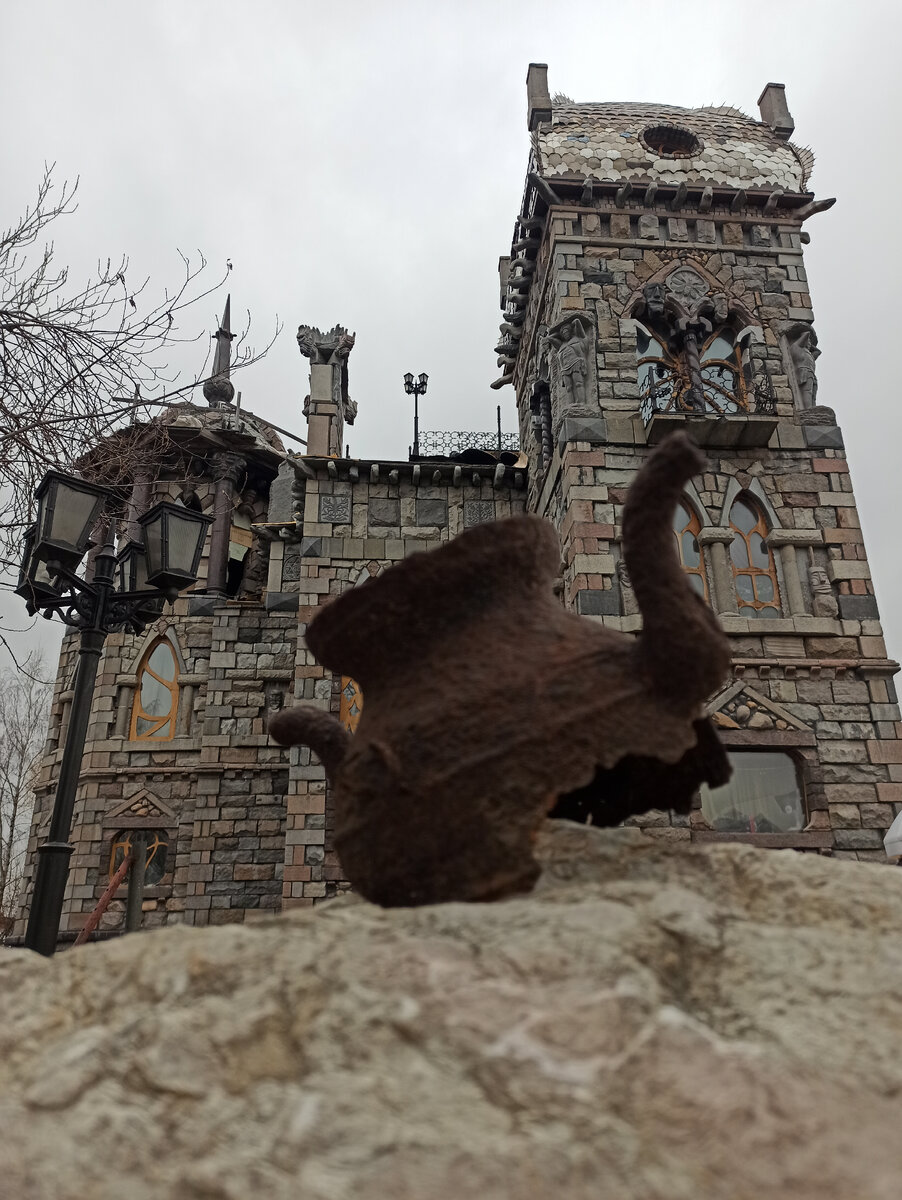 В Балашихе есть довольно интересный дом, можно даже сказать замок. Он необычен как снаружи так и своей внутренней отделкой. Строят его уже более десяти лет, и предполагается, что он будет многоквартирным. Уже сейчас во многих комнатах живут, но нас все же пустили посмотреть несколько внутренних помещений. Интерьер впечатлил оригинальными решениями. Винтовая лестница из массивного камня, подвешенного на цепях, и с перилами из рельсы и разнообразных шестерен. Оконная рама в виде паука. Люстра из колеса и утюгов. Ванная из цельного камня. Ее кстати поднимали на третий этаж краном, когда ещё не было крыши. Вокруг крыши сидят демоны, у которых во рту встроены парогенераторы с подсветкой. Такой дом отлично подойдëт для празднования Хэллоуина или для шабаша 😉. #необычный дом #замок #балашиха #московская область