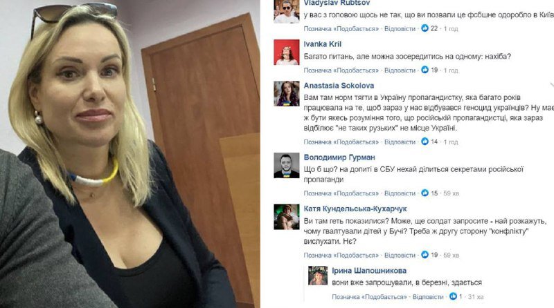 После отменённой со скандалом пресс-конференции в редакции украинского «Интерфакса» экс-редактор Первого Канала и свежеиспечённая журналистка Die Welt Марина Овсянникова отправилась в Одессу (там она родилась), а потом вернулась в Киев. И теперь получает с двух сторон. В последних твитах Овсянникова рассказывает про приложение с информацией про воздушные тревоги, а также поражается пустым улицам и комендантскому часу: «Родная Одесса встретила меня пустыми отелями и заминированными пляжами. Купаться запрещено. Российские военные корабли постоянно обстреливают город с моря. Никто не может спрогнозировать, куда прилетит очередной снаряд. Вся надежда только на совершенную систему ПВО. Но иногда она не спасает» В реплаях и комментариях от неё требуют покинуть Украину, — злорадствует Ксения Собчак. Глава Одесской администрации Сергей Братчук написал: «Московская мерзость продолжает колесить по Украине». Десятки высококвалифицированных российских независимых журналистов годами пытаются найти
