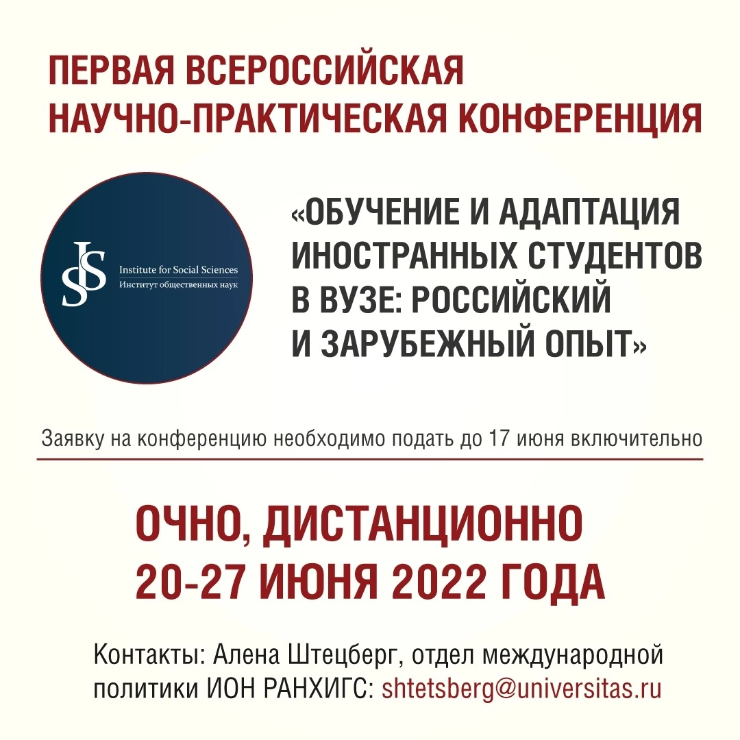 Приди и поделись СВОИМ опытом! 👌🏻 В Президентской академии стартует первая Всероссийская научно-практическая конференция «Обучение и адаптация иностранных студентов в вузе: российский и зарубежный опыт». 📆С 20 по 27 июня Институт общественных наук РАНХиГС приглашает всех желающих принять участие в формате круглого стола в обсуждении вопросов, связанных с состоянием образовательной системы в России и мире, проблемами, которые приходится решать студентам-международникам, перспективами развития учебного процесса и инновационными системами в сфере образования. Свои доклады могут представить преподаватели русского языка как иностранного, организаторы дополнительных программ профессионального и языкового обучения, руководители и сотрудники отделов международного обмена университетов, а также иностранные студенты, обучающиеся в России и российские студенты, имеющие опыт обучения за границей. В рамках конференции экспертам предлагается обсудить темы, связанные с подготовкой иностранных
