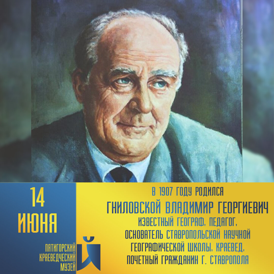115 лет со дня рождения В. Г. Гниловского (1907–1980), известного географа, педагога, основателя ставропольской научной географической школы, краеведа, Почетного гражданина г. Ставрополя. Владимир Георгиевич Гниловской родился 1907 году в Ставрополе. В 1928 году окончил Ленинградский педагогический институт имени А. И. Герцена. Несколько лет по распределению работал в г. Златоусте на Урале, после чего вернулся в Ставрополь, где возглавил кафедру географии Ставропольского педагогического института. В 1941 году был призван в саперные войска. Участвовал в защите городов Орджоникидзе, Грозного, Георгиевска, воевал в Донбассе. За заслуги в Великой Отечественной войне получил 8 боевых наград. После Победы В. Г. Гниловской несколько лет работал в Ставропольском суворовском училище, в 1951 году вернулся в Ставропольский педагогический институт. В 1952 году в институте географии АН СССР он защитил кандидатскую диссертацию. В общей сложности более 40 лет Владимир Георгиевич проработал в Ставропо