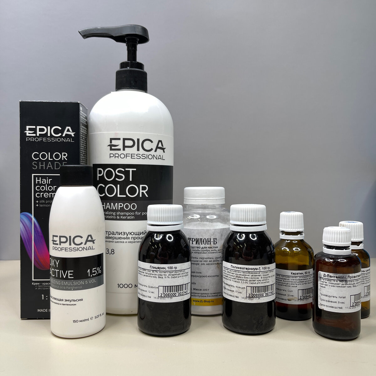краситель, окислитель, кислый шампунь (pH не ниже 5,5), трилон Б (динатриевая соль), поликватерниум - 7 (загуститель, блокиратор потери волосами цветового пигмента), а также добавочные активы (протеины шелка, глицерин, кератин, провитамин B5).