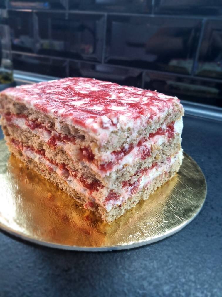 Ингредиенты: Коржі, яєць, цукру, олії, підсмажених і мелених горіхів, борошна, порошку до печива, Крем:, вершків (30-36%), сиру (кисломолочний змелений або вершковий), пудри, Полуничне конфі, полуниць, цукру, кукурудзяного крохмалю Способ приготовления: Коржі: Білки збити із щіпкою солі до стійкої маси додати цукор, збивати до піків. Додати жовтки, перемішати, додати олію, перемішати. Горіхи підсмажити і перемолоти, додати до маси, легенько перемішати. Додати борошно + розпушувач і перемішати. Спекти одним бисквітом при 180С 15-20 хв (форма 22) і розрізати на три частини. Полуничне конфі: Полуниці порізати або злегка зблендирувати, додати цукор і поставити на вогонь. Легенько помішуючи, коли почне легенько булькати, додати крохмаль, перемішати. Охолодити конфі. Крем: вершки + сир + пудра збити до стійких піків. Збірка: Крем ділимо на 3 частини, конфі на 2 частини. Корж/крем/конфі/корж/крем/конфі/корж/крем.