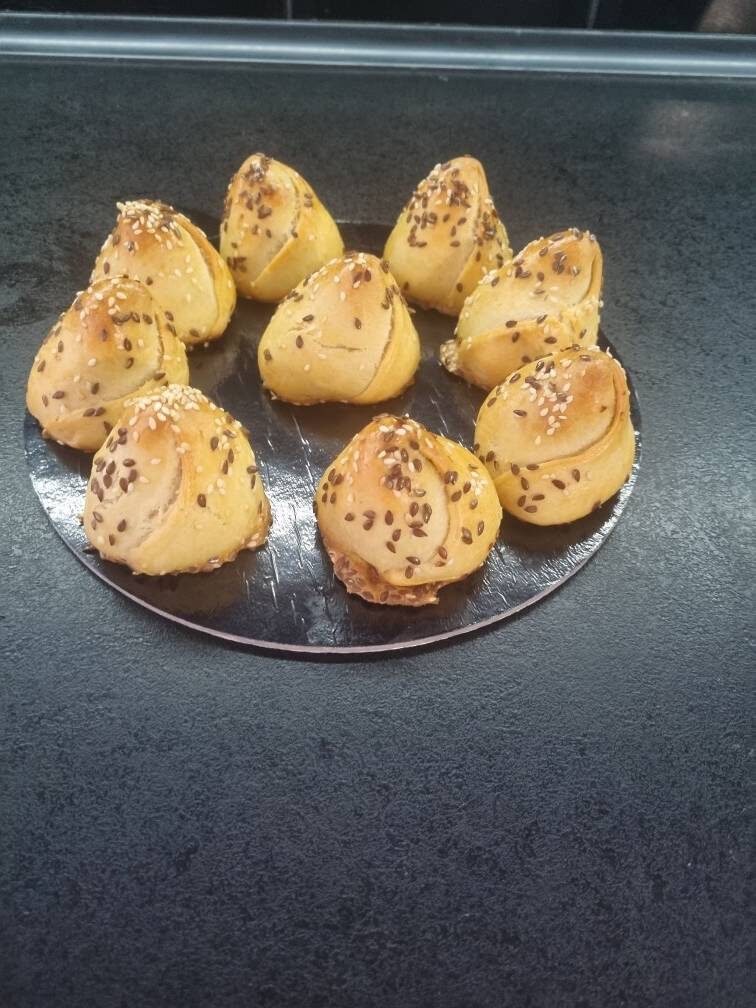 Ингредиенты: сметана, або йогурт, тепле молоко, рослинна олія, яйце, цукор, сіль, борошно, розпушувач, Начинка :, куряче філе, морква, цибуля Способ приготовления: Начинка: Цибулю нарізаємо і підсмажуємо на пательні, додаємо натерту моркву, тушимо 5 хв. Філе відварюємо і перемелюємо на мясорубці разом з цибулею і морквою, додаємо сіль, перець і розіл з філе за смаком. Тісто: З'єднати сметану (або йогурт), молоко,олію, яйця, цукор та сіль і добре перемішати до отримання маси однорідної консистенції. Додати борошно і розпушувач та замісити тісто. Накрити тісто плівкою та залишити на 15 хв. Далі формуємо з тіста кульки. Приблизно 45-50 гр. Вихід 30 шт. З кульок викатуємо круг, частково розрізаємо розміщаємо начинку (орієнтовно 20гр) і формуємо булочку. Мастимо збитим яйцем, за бажанням посипаємо кунжут/льон. Випікати при 180С приблизно 30хв.