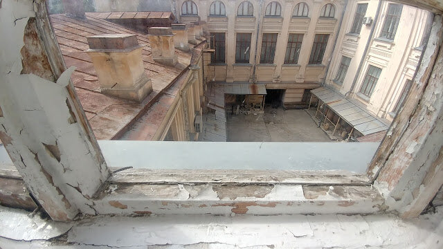 Удивительное "заоконье"... Я люблю выглядывать в окна музеев и заглядывать за угол. Обязательно увидишь что-то интересное. Внутренний дворик "для своих", запасники под открытым небом. Оказалось, что в Симферопольском музее так тоже можно :). Вид на "секретный" двор из "секретного" окна. Оно за шторой было. Как вам "евроремонт"? Всякие интересные штуки внизу... Выяснилось, что "а можно посмотреть" - здесь вполне легально. Эдакий ещё один "зал" под открытым небом. Представьте себе питерский двор-колодец, но с артефактами по углам (а не с тем, о чем вы подумали). Можно плюнуть в колодец, благо он - глухой. Слева угадывается знаменитая кочегарка "Камчатка"... Ну, это, конечно, фантазии и морок. "Прелестная сноповязалка" и древняя мозаика на стене. Большая часть каменюк - это различные надгробия. От древности (греки и римляне) до современности (французы и англичане). Пространство между стелами густо засыпано осколками керамики. Каменные "бабы" - оказались "балбалами". То, что они мужики -