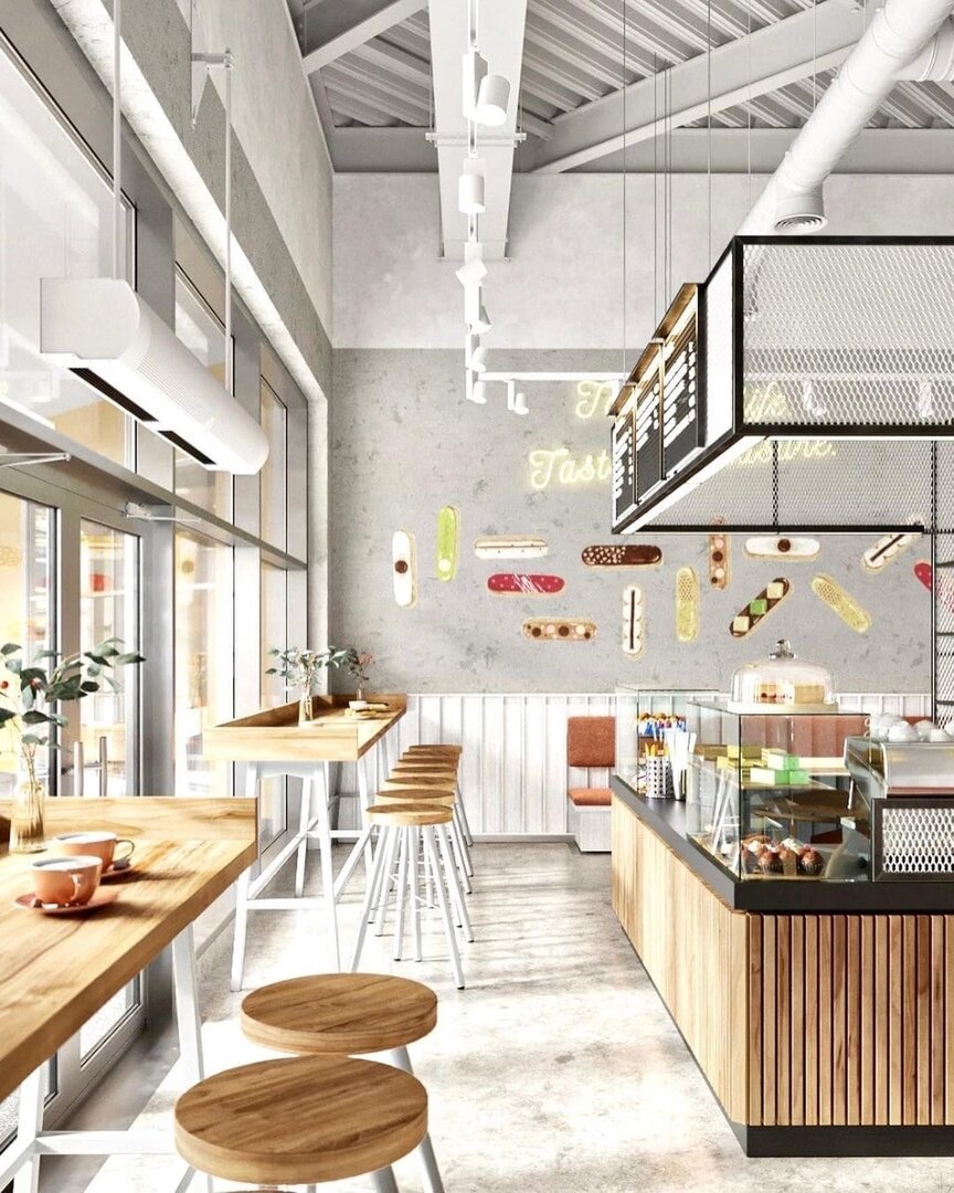 Теплые тона и сочетание чуть старомодной нежности с современной стилистикой – именно таким получился солнечный декор кафе, в котором на стенах расположились яркие изображения эклеров. В основу концепции кондитерской для Outlet Village лег европейский стиль. Аппетитные свежие оттенки, атмосфера уюта и легкости, грамотная планировка с расчетом на комфорт каждого посетителя – на это мы основывались при разработке дизайн-проекта. В центре кафе расположилась основная зона, вокруг которой строился остальной интерьер. Оформление интерьера с легкой отсылкой к эко направлению гармонично разбивается насыщенными и яркими цветами, создавая хорошее настроение для каждого гостя. Проект эклерной, разработанный нами, это удачный пример того, как сделать пространство в торговом центре уютным, привлекающим внимание и вызыва