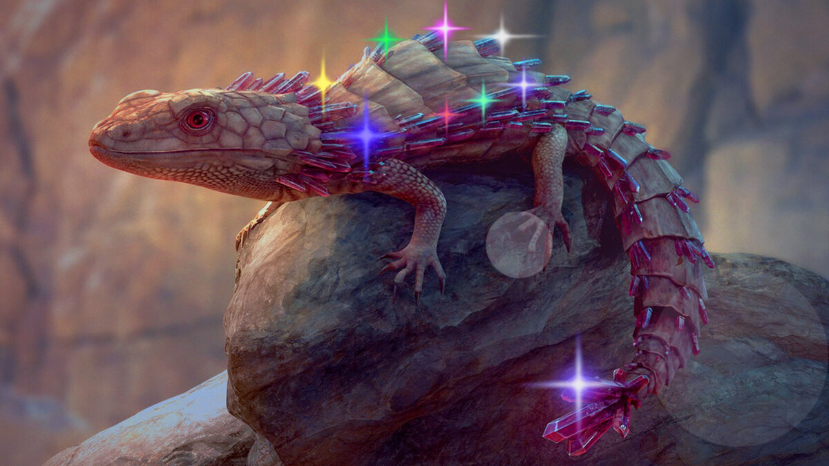 Самой примечательной частью сверкающих ящериц является их чешуя, которая по мере жизни становится всё твёрже и ценнее. В зависимости от рациона ящерицы, её чешуйки приобретают свойства различных минералов, а у старых особей и вовсе становятся драгоценными камнями. На свету эти существа горят всеми цветами радуги, по этой причине ящериц и назвали сверкающими.