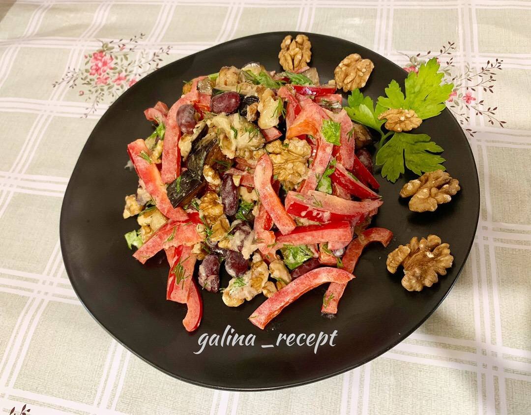 Ингредиенты: Баклажан крупный, Перец болгарский крупный, Фасоль красная , Орехи грецкие, Чеснок , Кинза (либо укроп или петрушка), Майонез , Соль, ч.м.перец