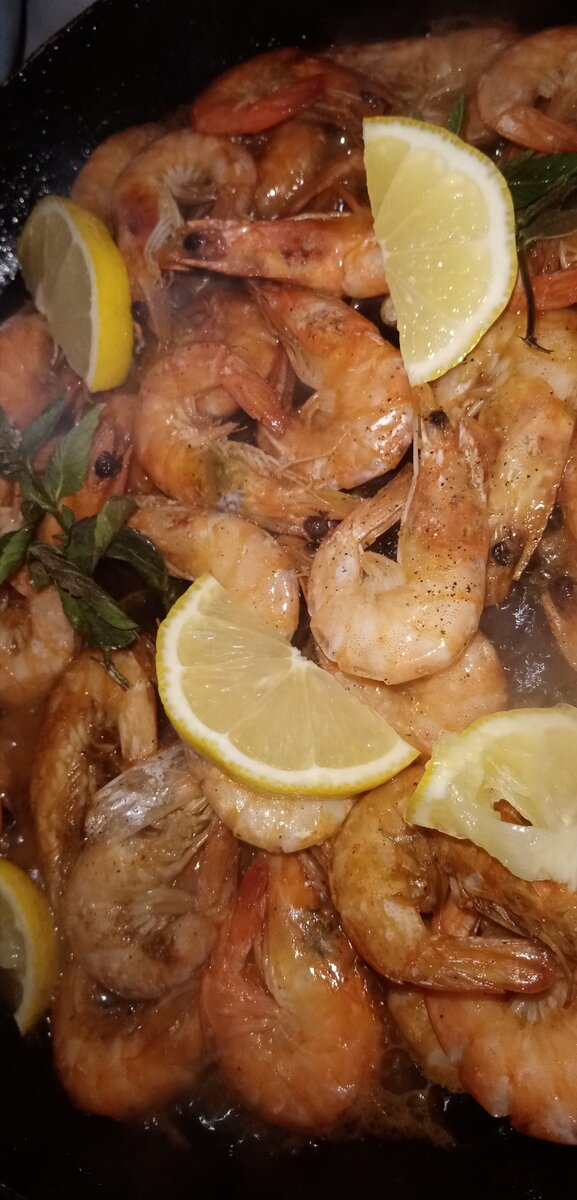 Кто любит креветки точно оценит этот рецепт. У нас в семье их любят все. А приготовленные по этому рецепту, сметаются за секунды. Правда-правда) Для приготовления креветок по этому рецепту нам понадобится: Креветки - 600гр Сливочное масло - 50-70 гр Соевый соус - 4-5 ст. л Свежая петрушка - 4 веточки Веточки мяты- 2-3 шт Лимон - 1 шт Лимонный сок - 1 ст. л Имбирь свежий - 5-10 гр Соль, перец по желанию На сковороде растапливаем сливочное масло и выкладываем креветки. Добавляем к ним нарезанный имбирь, веточки мяты и петрушки, обжариваем на среднем огне постоянно помешивая 3 минуты. Затем добавляем соевый соус, лимон нарезанный дольками, лимонный сок и перец. Обжариваем помешивая ещё 5-10 минут на слабом огне. Выключаем. Добавляем 1 свежую веточку мяты и накрывает крышкой на 2 минуты. Совет при выборе креветок: Свежие креветки всегда хорошо скручены (свернуты), если они развернуты, значит уже не первой свежести. Благодарю что дочитали до конца. Жду ваши отзывы в комментариях.