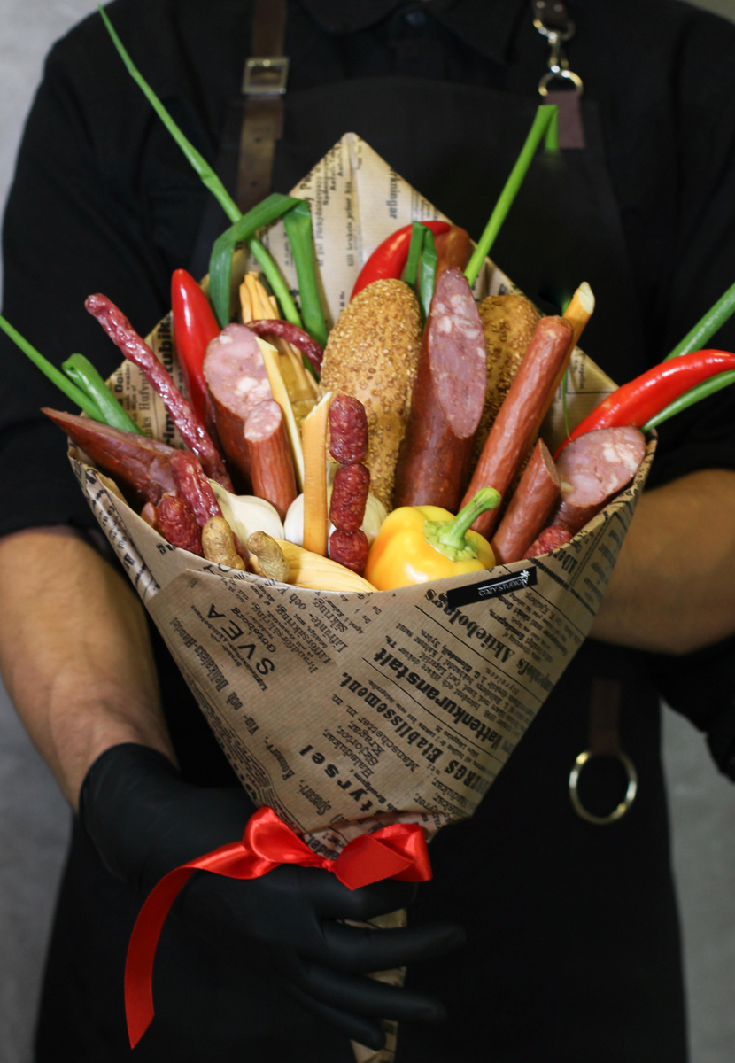 1) для основы может использоваться бутылка, на которую можно наклеить шпажки: 2) можно использовать корзину; далее, нужно определиться с основным составом, чаще всего это колбаски разных видов и размеров, нижк приведу пример: Также могут быть использованы овощи, например, помидоры черри 3) овощи и фрукты можно купить почти в любом продуктовом магазине 4) далее нужна упаковка. Упаковка лучше будет смотреться из бумаги, особенно если она с символичным рисунком. 5) В зависимости от повода, любое украшение будет только кстати Подарок получится очень красивым и аппетитным, желаю всем успехов в приготовлении этого подарка Какие еще подарки можно сделать своими руками можно прочитать здесь (нажмите, чтобы прочитать). Ставьте лайк и подписывайтесь на мой канал (нажмите, чтобы подписаться), чтобы все ваши подарки были такими вкусными и полезными. #съедобный подарок #подарок мужчине #самодельный подарок #Подарок
