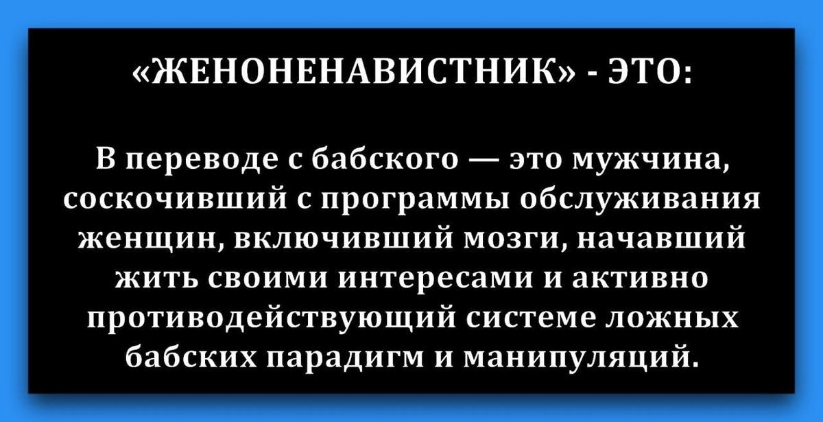 Женоненавистники... кто они такие ? Может быть это те, которые запрещают матерям видеть своих детей ? Может быть они лишают матерей жилья и заставляют женщин работать на трёх работах для выплаты алиментов на детей, которых те не видят ? Нет, оказывается женоненавистник это те, которые требуют выполнения законов о равноправии по факту, а не на бумаге. Вот лично я радуюсь и тепло разливается по всему телу, когда меня называют женоненавистником. Эта фраза в адрес мужчины означает то, что он и есть тот самый настоящий мужчина. Который : А. Достаточно умён чтобы осознать современные реалии положения мужчин. Б. Не боится об этом говорить в слух. В случае, если мужчина ещё и не выходит из себя на эту фразу, не оправдывается, не "включает заднюю", то это достойный мужчина. Настоящий достойный мужчина не пляшет под женскую дудку. Он чётко понимает, когда кто-то пытается поиграть на его нервах. Притвориться жертвой, с целью вызвать жалость и таким образом добиться своего. И вот именно такие мужч