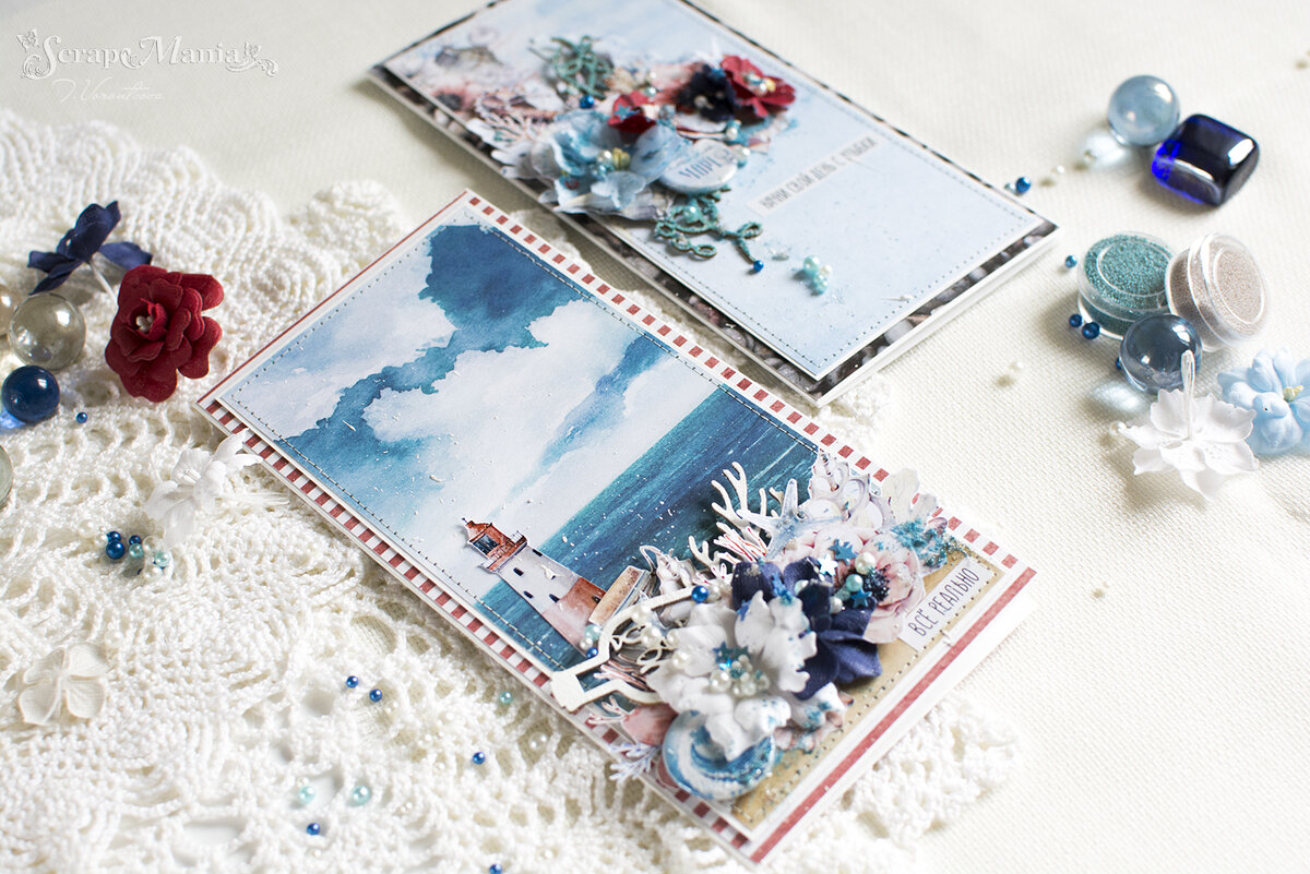 Совсем немного, но очень сильно)) Такая вот странность. Я не великий любитель моря как возможности позагорать на берегу и уж тем более поплавать. Плавать я так и не научилась, хоть мне уже много годиков)) Но есть в море особая притягательность: невероятная мелодия волн и самые красивые закаты. Вот по этому да, по этому я скучаю. И еще по тому, как солнце отражается в воде тысячей бликов. И чайки парят на поверхностью бесконечного синего самых невероятных оттенков. М вот в этом состоянии невольной скуки по морю, я создала пару морских открыток. Одна из открыток про маяк. Маяки - это отдельная тема. Маяки прекрасны, таинственны и притягательны. Я обожаю их всем сердцем. А вторая про морское дно. Я его никогда не видела вживую, но представляю как-то вот так: пышным созвездием кораллов и водорослей, пугливых морских обитателей. Открытки, конечно, для любимой ScrapMania. Из очень красивой, нежной коллекции "Море, я скучала".