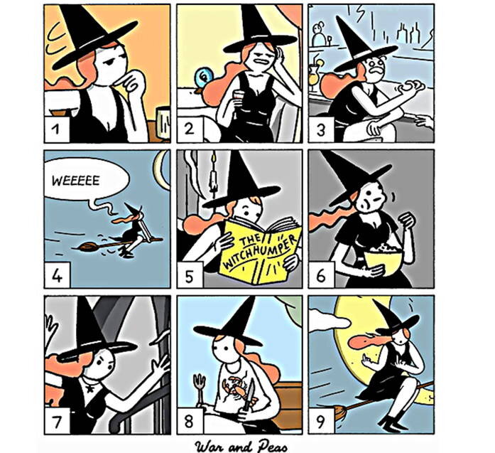 Что мы знаем о ведьмах из #кино и книг? Это красотки, которые колдуют, дружат (или сражаются) с нечистью, пытаются жить обычной жизнью и найти свою любовь. Героиня серии комиксов War and Pease (Война и горох) такая типичная ведьма. Также она любит пошалить и повеселиться "по тёмному". Её домашний любимец - чёрный кот, а ухажёр - вампир. А ещё она немного распутная, ведь её имя - Slutty. Но давайте простим рыжей ведьмочке непостоянство в настроении и частые романы. А назовём нейтрально - шалунья Слатти. Хотите взглянуть на её приключения? Какая ты сегодня, ведьма? Рисовка лиц и фона в комиксах простая. Но это не мешает художникам Элизабет Пич и Джонатану Кунцу придавать им выразительности и эмоций в нужный момент. Истории про #нечисть и #колдовство интересны широкой аудитории, а взрослые шутки в них несложно замаскировать. А ещё в кадре всегда есть мелкие детали, дополняющие происходящее: бокал, птичка, звёзды и т.д. Было больно? Один из самых распространённых способов пикапа у самоув