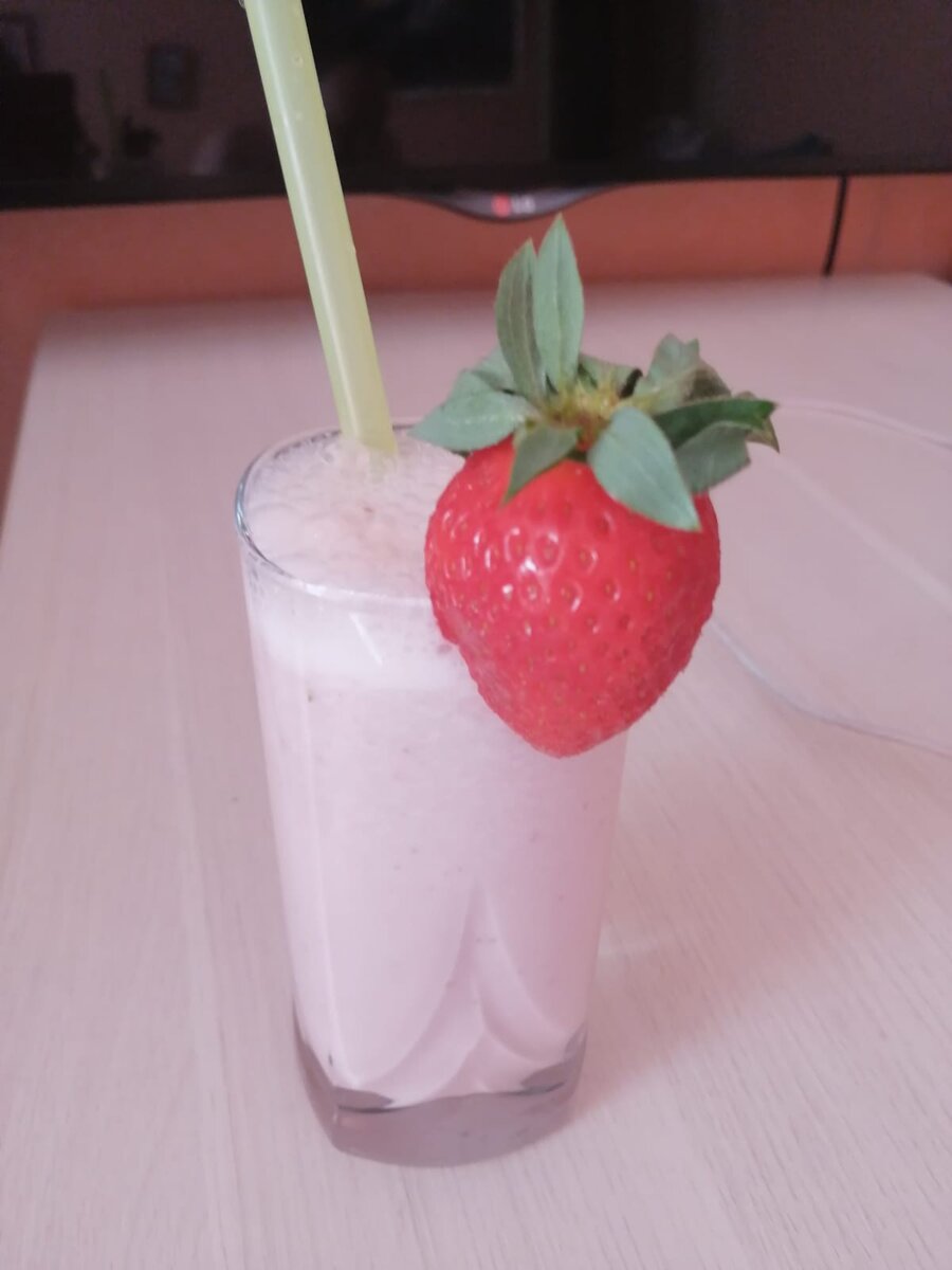 Залить молоко в блендер, положить клубнику, банан 2-3 кружочка, измельчить.