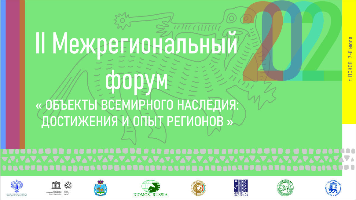 Приглашаем принять участие в II Межрегиональном форуме «Объекты Всемирного наследия: достижения и опыт регионов», который состоится 7-8 июля 2022 года по адресу: г. Псков, ул. Конная, 2. Межрегиональный форум, посвященный объектам Всемирного наследия ЮНЕСКО, пройдет уже во второй раз. Мероприятие стало важным событием в сфере сохранения культурного наследия Псковской области и других регионов – новой профессиональной платформой для обмена достижениями и опытом, разработки новых стратегий и планов. Форум дает возможность обсудить актуальные вопросы сохранения, популяризации, управления и продвижения объектов культурного наследия, определить направления для будущей работы. Форум пройдет в рамках проведения в РФ Года культурного наследия народов России.