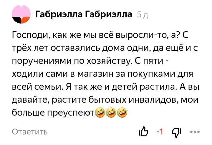 Габриэлла, почему-то считает, что все кто иначе воспитывает детей, обязательно вырастят бытовых инвалидов. Но она этому рада, так как 👉её детям больше достанется.
