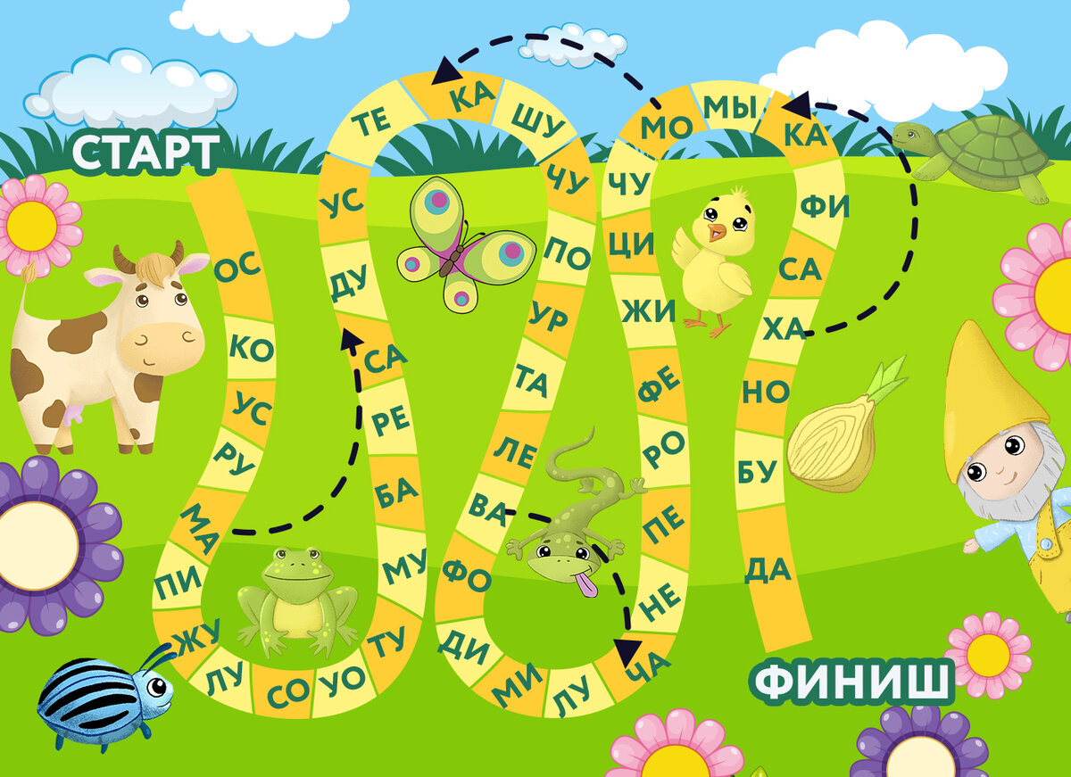 Вооружайтесь игральным кубиком и фигурками или фишками. Игра направлена на чтение слогов. Бросайте по очереди кубик, двигайтесь по ячейкам и читайте слоги. Играйте с удовольствием. Подробнее узнать об онлайн-школе "Скороговорун" и методике обучения можно тут: https://read.skorogovorun.com/