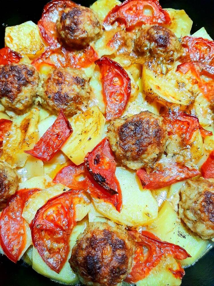 Овощи, приготовленные в духовке с мясными фрикадельками - вкусно, быстро и без лишних заморочек🙃😉. #непп #фрикадельки #овощивдуховке #ужин #обед #быстро #вкусно #мясныешарикивдуховке Ингредиенты: мясного фарша, яйца, кабачок, баклажан, помидора, молодых картофелины, приправы Для жаркого, перец Чили сушеный, соли (в фарш и овощи), луковица, чеснока, майонезного соуса, соевого соуса, зелени сушеной, растительного масла Способ приготовления: Овощи помыть и порезать дольками одинакового размера, картофель я не чистила! так как он молодой, то я его тщательно помыла и порезала вместе с кожурой. Добавляем немного соли, порезанный лук приправы, перец Чили и зелень сушеную. В фарш добавляем яйца, соль, перец все смешиваем и формируем небольшие фрикадельки. В форму для запекания выкладываем овощи (я делала слоями, можно просто разложить хаотично)между ними распределяем дольки чеснока. На них выкладываем фрикадельки и дольки помидор. Майонез смешиваем с соевым соусом и половиной стаканчика воды