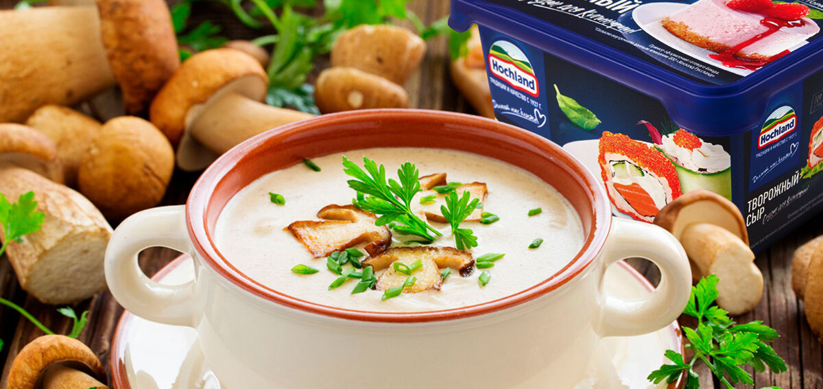 Домашний суп — это не только морковка, картошка да куриная ножка. Суп может быть изысканным, как в лучших ресторанах Парижа! Попробуйте приготовить грибной крем-суп на своей кухне и убедитесь в этом сами. ИНГРЕДИЕНТЫ: · Творожный сыр Hochland «Для кулинарии» – 150 г · Овощной или грибной бульон – 1 л · Шампиньоны – 500 г · Белые грибы – 200 г · Белый лук – 1 шт. · Сливочное масло – 100 г · Растительное масло – 20 г · Сливки 35% - 100 г · Петрушка – 20 г · Белый перец – 5 г · Соль ПРИГОТОВЛЕНИЕ: 1. Порезать грибы и лук. 2. Обжарить грибы и лук в смеси растительного и сливочного масла. Часть грибов отложить. 3. Залить обжаренные грибы бульоном и проварить 25 мин. 4. Добавить сливки. 5. Залить получившуюся массу в блендер и размешать до кремообразного состояния. 6. Добавить в крем-суп 100 г творожного сыра, размешать. 7. Смешать 50 г творожного сыра со сливками и петрушкой до кремообразного состояния. 8. Подавать в тарелке, положить сверху ложку сырной массы с зеленью и жареные грибы. Рец