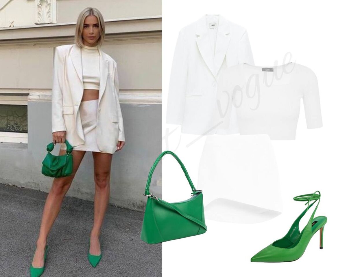 Сегодня выбрала для вас тотал белый лук с зелеными деталями. Вы, наверное, уже поняли, что я люблю этот цвет 💚 Ссылки: пиджак, топ, юбка-мини, туфли, сумка Еще подготовила для вас аналоги: белая юбка миди, топ на бретелях