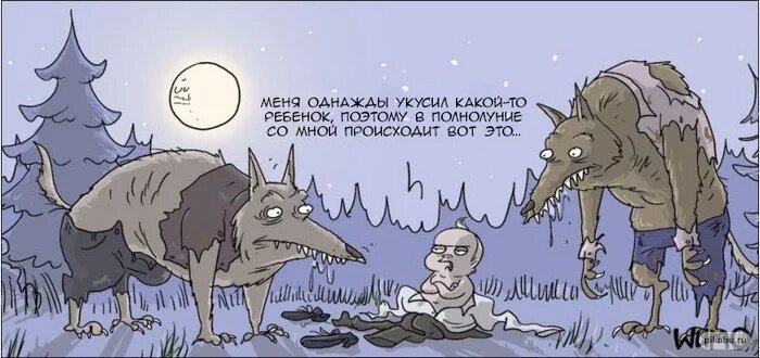 Привет, дорогой друг! У каждого человека можно найти какие-то слабые места или страхи, ведь без них, к сожалению, просто невозможно. Кто-то боится темноты, кто-то пауков, а кто-то склонен верить в #сверхъестественное — в существование более опасных (хоть и не доказанных наукой) монстров. Например, оборотней. Сегодня я собрал в подборку забавные #комиксы , которые посвящены этим пугающим и мрачным существам. Надеюсь, #юмор поможет хоть как-то развеять окружающую их кровожадную ауру. Считается, что превращение в оборотня происходит из-за укуса другого такого монстра. Так что лучший способ не выть каждое полнолуние — это избегать представителей этого вида. Но если бы подобная механика работала и при других укусах, как заметили авторы WUMO, каждую полную луну мы бы наблюдали очень смешные картины. Пугающее превращение в оборотня всегда происходит под воздействием лунного света, поэтому #полнолуние имеет такую силу. Однако, луна светит каждый день, не только в полнолуние, поэтому автор Dyst