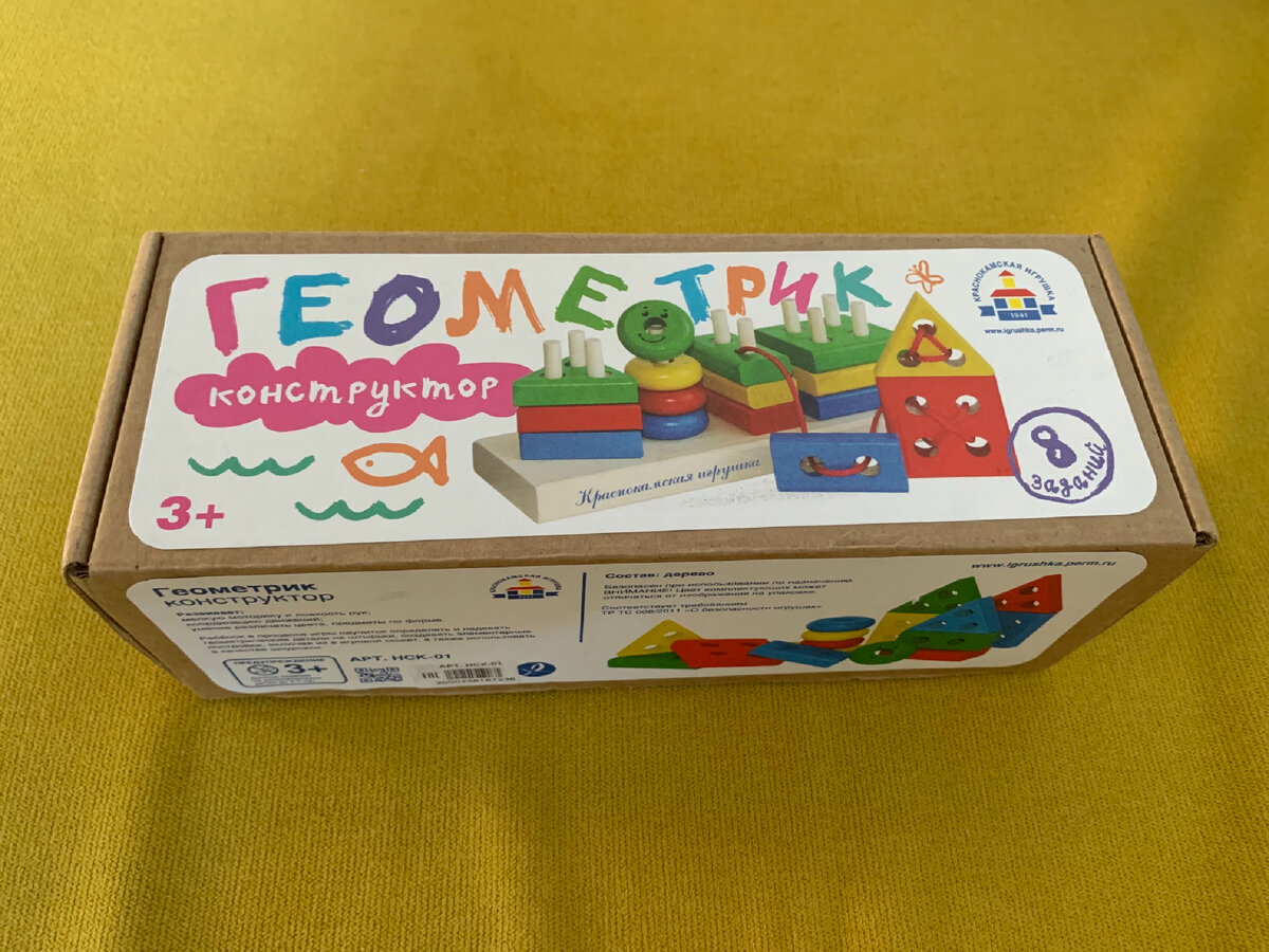 Набор строительных деталей "Геометрик" от Краснокамская игрушка. Педагоги раннего развития уверяют, что в 2 года ребёнок должен свободно собирать данную пирамидку. Некоторые дети якобы могут собрать эту пирамидку к 1,5 годам. В своём ребёнке я уверена. Она как сейчас чхать хотела на «Геометрик», так и к 1,5 годам ситуация не сильно изменится. Как играть? 1. Для начала необходимо познакомить малыша с нанизыванием колечек на один штырёк. (К слову, это мы хорошо умеем ещё примерно с 1,2 года) 2. Далее можно знакомить с нанизыванием сначала на два штырька, затем на три, потом и маме сложное - на четыре. Моя дочь не согласна выдать прямогонник именно на два штырька, предназначенные для прямоугольника. Она вдевает их на треугольник, на квадрат, на один штырёк от кружочков, но ни как не на два соответсвующие. 3. У производителя в наборе есть карточки - дополнительные занятия. Мы ими не пользовались - не доросли . 5. Производитель также предусмотрел совершенно дурацкий шнурок, якобы испо