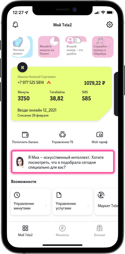 Кто такая Миа и как это работает Искусственный интеллект – это современная технология, которая способна обучить компьютер и роботизированную технику мыслить разумно, подобно человеку. Благодаря этому направлению науки, мир научился анализировать поведение пользователей в сети и подбирать тот контент и предложения, которые будут полезны именно ему. Мы следим за новыми технологиями и всегда предлагаем своим абонентам современные решения. Миа – это искусственный интеллект от Tele2. Отзывчивый помощник, который всегда действует в интересах абонента и предлагает выгодные для него решения. Все абоненты Tele2 разные и понятие выгоды – личное для каждого. И сейчас Миа не только рекомендует актуальные сервисы, но и умеет анализировать ваш тариф и услуги. Исходя из этого, она подскажет, что подойдет вам прямо сейчас и поможет настроить выбранные услуги. Смотрите фильмы? Миа подберет сервис, чтобы просмотр был еще приятнее. Заканчивается интернет-трафик? Наш искусственный интеллект подскажет выго
