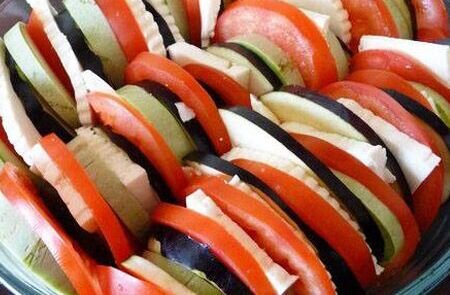 Кулинарный рецепт: Рататуй с брынзой По-летнему яркое и сочное овощное блюдо готовится быстро и просто. Сыр добавляется в состав для любителей сыра и для тех, кому не хватает сытости - он хорошо сочетается с овощами и придает особый вкус. Подписывайтесь! Для приготовления вам понадобятся: баклажаны - 260 гр; помидоры - 300 гр; цуккини - 500 г; сыр - 250 г; подсолнечное масло - 1 столовая ложка. Для соуса: сладкий перец - 200 гр; лук репчатый - 100 гр; подсолнечное масло - 1 столовая ложка; помидоры - 150 гр; зубчик чеснока; соль и перец. Как приготовить? Цуккини и баклажаны нарезать ломтиками небольшой толщины - 3-4 мм, то же самое сделать с помидорами. Примерно треть всех помидоров - это кружочки, которые обрезаются по краям, их можно положить на соус. Брынзу также нарезать ломтиками толщиной 3 мм и размером примерно с диаметр остальных овощей. Смазать форму для запекания маслом, выложить все овощи по краю, равномерно чередуя с сыром. Посыпьте сверху солью и перцем, отложите в сторону