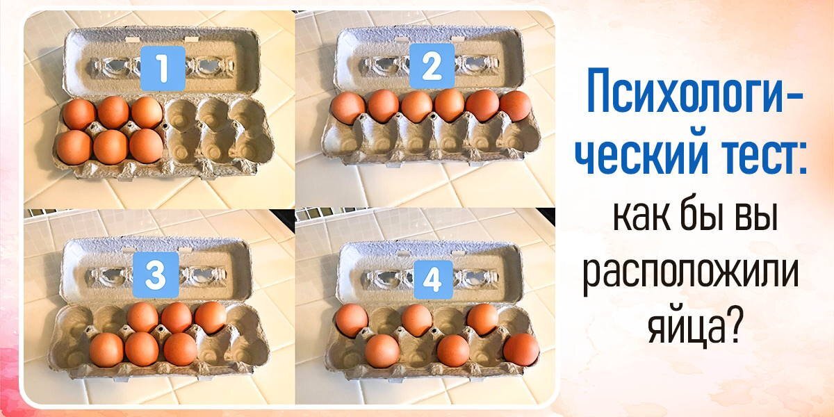Представь, что у тебя в холодильнике имеется полкоробки куриных яиц. Нужно выяснить, каким способом ты разместишь оставшиеся в лотке яйца, чтобы эта картина казалась самой гармоничной и правильной. Как в таком случае выглядит твоя идеальная коробка? 1)Если все оставшиеся куриные яйца сложены двумя рядами компактно в левой либо правой части коробки, то это выбор человека с мощными организаторскими способностями. Этот вариант чаще всего оказывается самым приемлемым для людей с развитой логикой и аналитическим ум