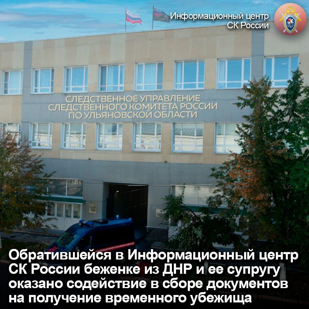 Обратившейся в Информационный центр СК России беженке из ДНР и ее супругу оказано содействие в сборе документов на получение временного убежища На горячую линию для беженцев Информационного центра СК России 8-800-100-12-60 (#6) обратилась жительница ДНР, прибывшая в Ульяновскую область. Она сообщила о том, что у нее и ее супруга возник ряд вопросов, касающихся процедуры получения временного убежища в Российской Федерации. В результате взаимодействия Информационного центра со следственным управлением СК России по Ульяновской области и региональными органами власти супругам даны подробные разъяснения по волнующим вопросам и оказано содействие в подготовке и сборе документов, необходимых для получения временного убежища. В ходе личного приема они поблагодарили сотрудников СК России за проявленное неравнодушие и оказанную помощь. Напоминаем, что с полезной информацией для граждан, прибывших из Донбасса и с Украины, экстренно покинувших свои дома, можно ознакомиться в материалах прое