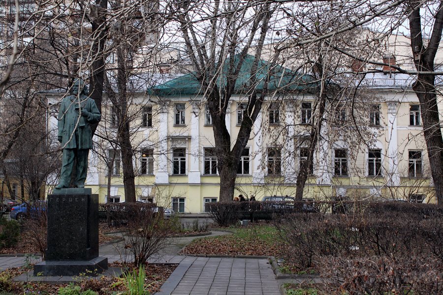 У этого здания четыре жизни! Первая — усадебная. Вторая — послереволюционно-писательская. Третья — придуманная Булгаковым. И четвертая — жизнь Литературного института. В доме, где сейчас располагается Литературный институт имени Горького, в 1812 году родился внебрачный сын богатого помещика И.А. Яковлева — писатель и публицист Александр Герцен. Усадьба принадлежала сенатору А.А. Яковлеву, дяде писателя. Александр Герцен прожил здесь первые 5 месяцев, а после бывал только гостем, так как дом завещали его двоюродному брату. Новая жизнь началась у дома в 1920-е, когда там открылся ряд литературных организаций: РАПП (Российская ассоциация пролетарских писателей), МАПП (Московская ассоциация пролетарских писателей) и т.д. Все это — прототипы Булгаковского МАССОЛИТа в «Мастере и Маргарите». В романе писатель называет это здание «домом Грибоедова» и даже рассказывает его «историю»: якобы он получил это имя, так как зданием владела тетка писателя.