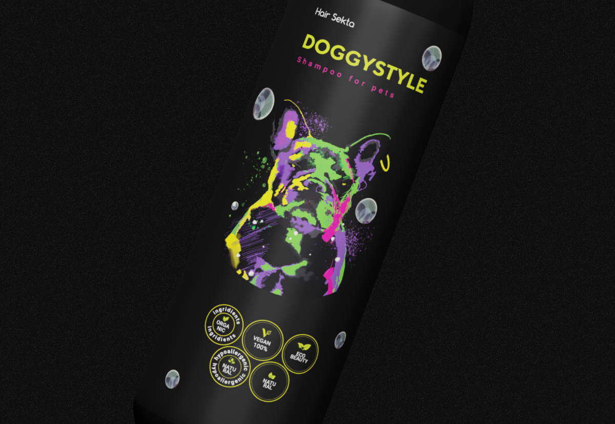 Разработали дизайн этикетки и 3d конетнт для e-commerce шампуня для собак DOGGYSTYLE SHAMPOO