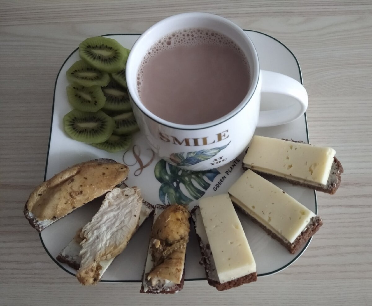Бутерброды из бородинского хлеба (57г), сливочного масла (11г), финского сыра (29г) и куриного шейка (48г), киви (37г) и какао (7г) Несквик (200мл) с молоком 2,5% (66мл)