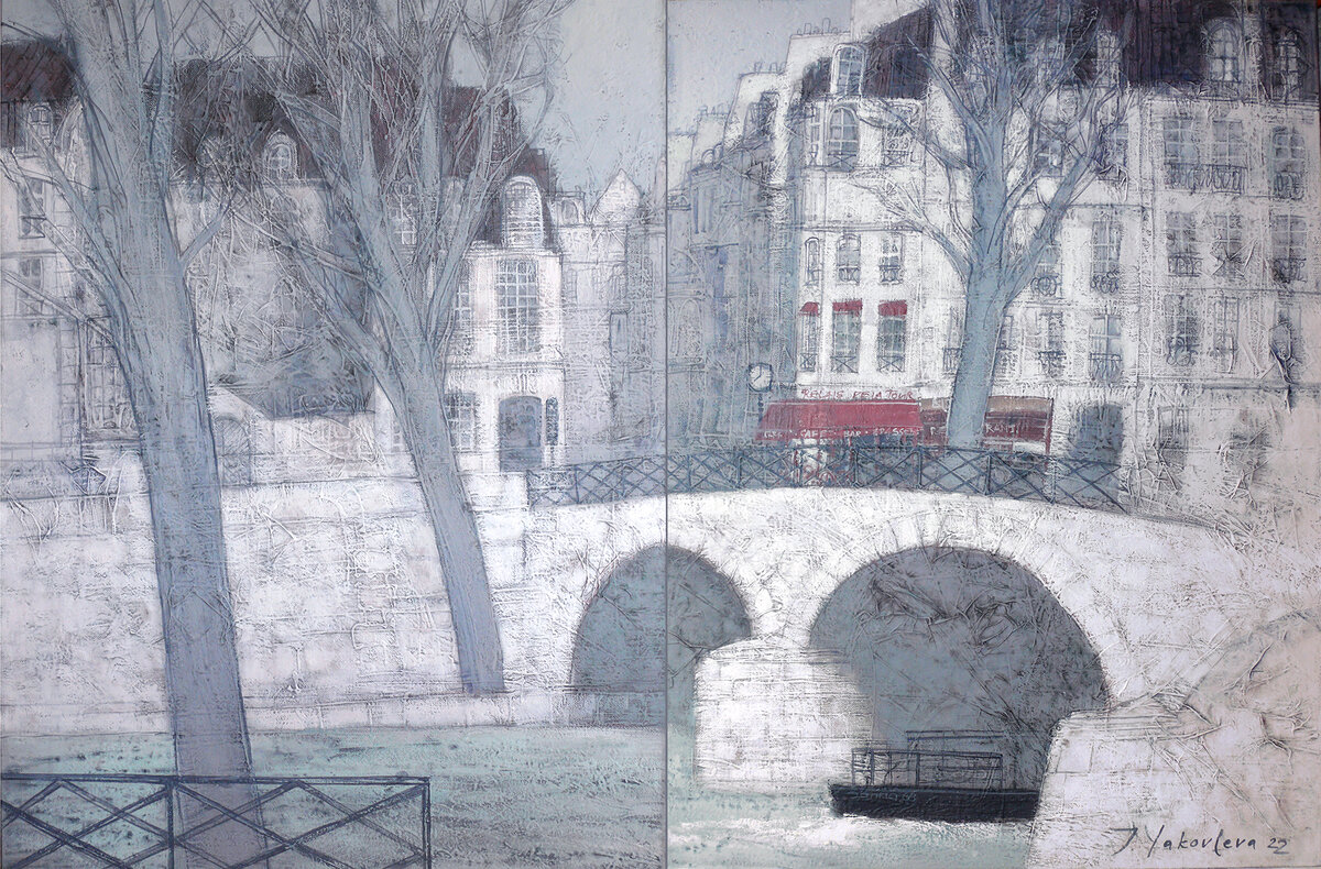 «Работы Жанны Яковлевой – это картины-дневники, собранные по наброскам из заграничных путешествий художницы. На картинах автора отражены Париж, Амстердам и другие европейские города. Многие художники 19 века черпали вдохновение в зарубежных поездках по странам Европы. Они погружались в различные культурные слои в стремлении собрать материалы для своих работ, которые бы обладали колоритом места и отражали его главные особенности. Жанна Яковлева репрезентует европейские города, показывая характер архитектуры, текстуру времени, запыленность мощеных площадей и характерные особенности маленьких средневековых улочек. По цветовой гамме ее работы тяготеют к пастельности и сравнимы со старинной фресковой живописью. Диптих «Сена река. Париж» приглашает нас насладиться маленьким сказочным путешествием» (куратор галереи SMART, искусствовед, Горбунова Мария). Образование: Московское Высшее художественно промышленное училище (сейчас академия им. С.Г. Строганова). С 2000 года состоит в Московском со