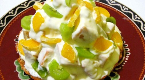 4. Сверху полить оставшимся кремом и украсить фруктами по вкусу.