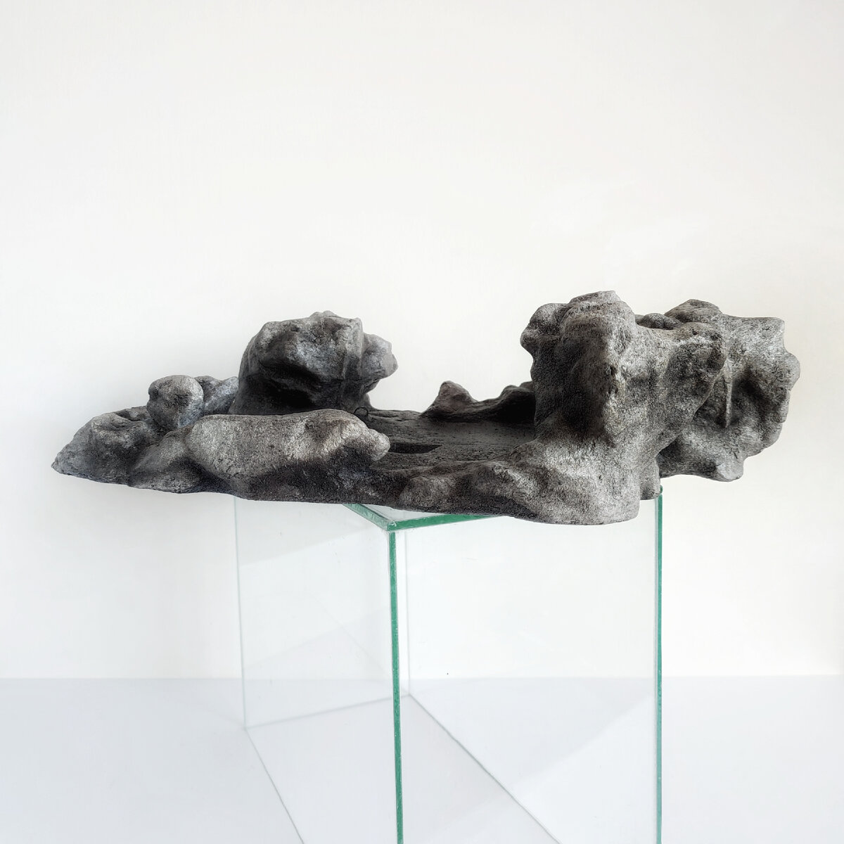 Эта работа — символ ушедшей воды. Дно горной реки, изменившей свое русло. Силой течения рыхлая порода вымывается, образуя каменные островки-останцы. Со временем ветер и сходы наносят в русло почвенный слой. И в нем вырастают деревья. Каменный поток ландшафт для бонсай бетон, металл, 50 х 28 х 11 см