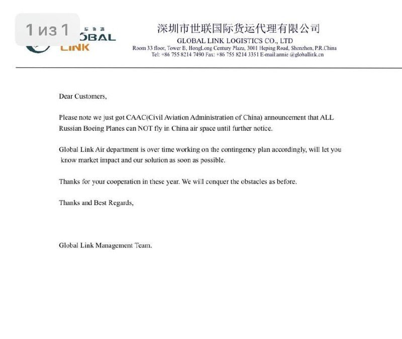 В сети появился документ о том, что основной грузовой оператор Global Link Logistics Co Ltd проинформировал, что СААС (Китайский регулятор гражданской авиации) запретил самолётам Боинг авиакомпаний РФ летать в воздушном пространстве КНР. Ну и дальнейшую приписку, которую все дружно проигнорировали: “Global Link Air Department is over time working on the contingency plan accordingly, will let you know market impact and our solution as soon as possible”. В общем, китайцы проинформировали, что сами же ищут решение. Ну а СААС дала комментарии, которые были максимально дипломатичны.