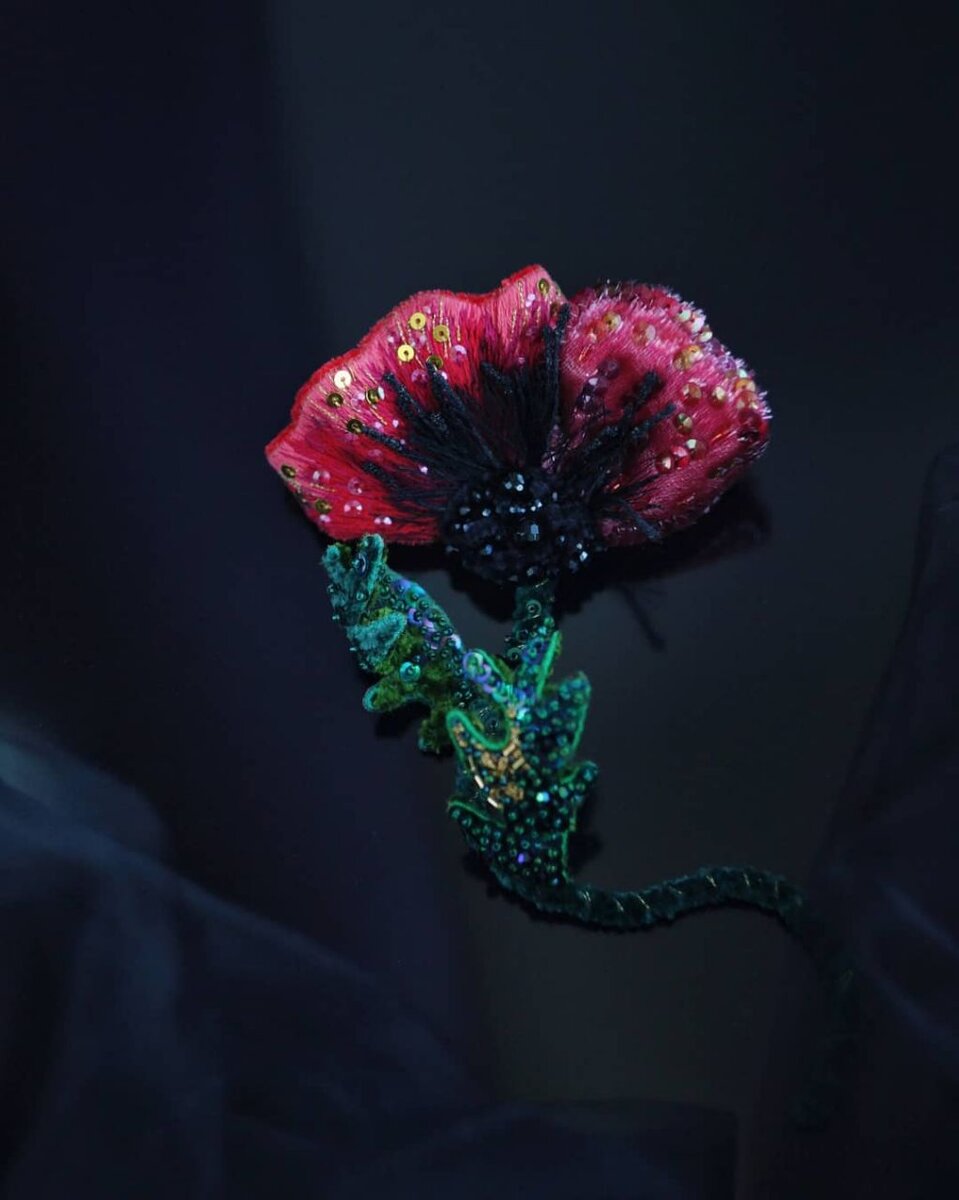 Первым каркасным цветком, на который я решилась, был мак. Почему выбрала именно его, даже не знаю. Были варианты и попроще. Но я на тот момент не испугалась сложной формы листьев и лепестков. И да, здесь я пошла по пути, который так люблю, использовала сочетание разных материалов и техник. Долой однообразие)) Часть мака была из необычного блестящего бархата, часть вышита гладью. Листья я сделала двухсторонними для того, чтобы можно было придавать им любую форму, и даже закручивать, показывая изнанку. Для листьев использовала шёлковую синель, пайетки и бисер. Все части цветка были на проволоке, поэтому как лепесткам, так и листьям, и стеблю можно было менять форму, создавать дополнительный изгиб. С тех пор работ на каркасе, как мне кажется, у меня было больше, чем обычных. Втянулась! После мака сразу же пошли бархатные цветы. Уж очень мне нравились бархатные лепестки. Этот шёлковый материал, как по мне, лучше остальных подходил для создания цветов. И если вы ещё не пробовали делать бар