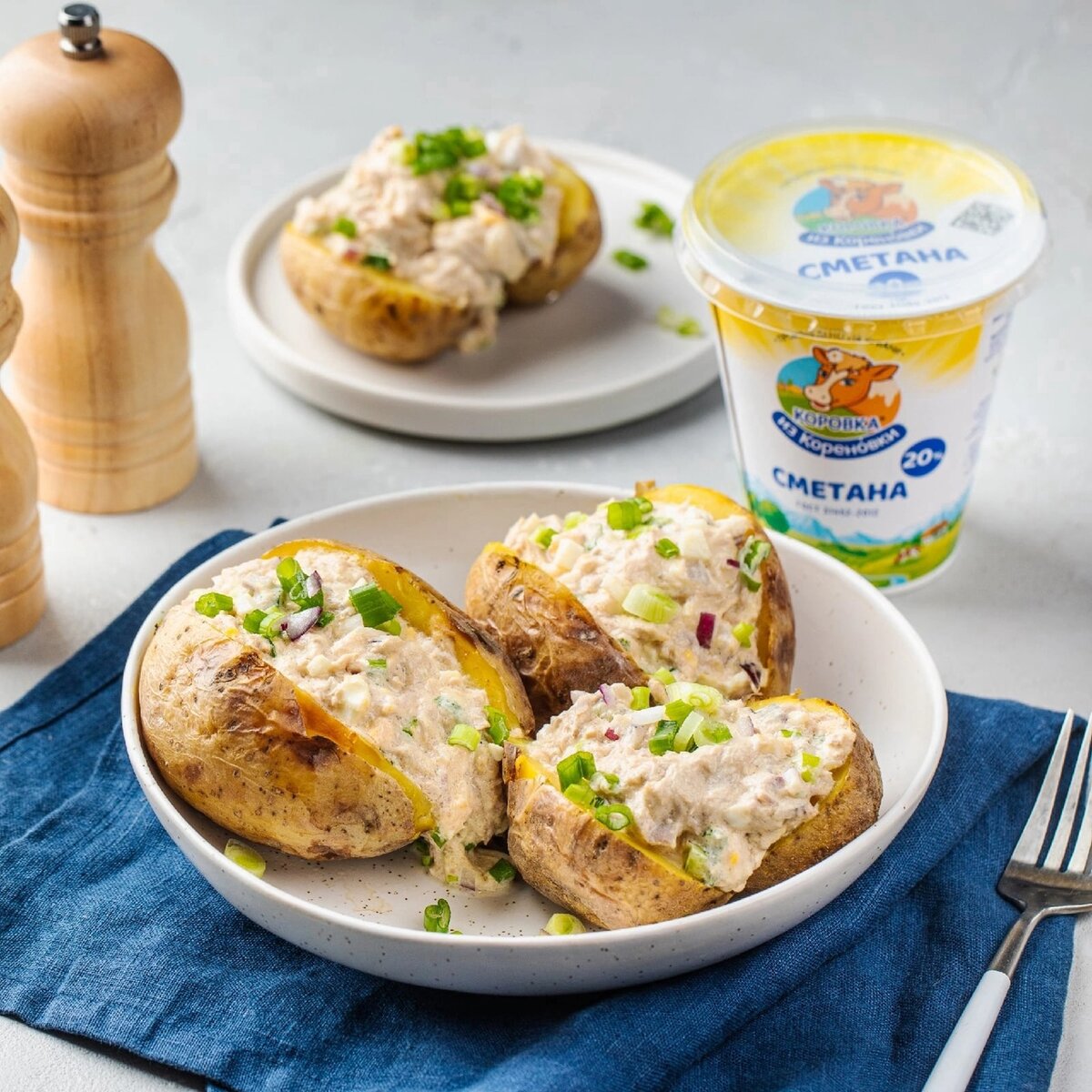 Мы рекомендуем с тунцом! Эта рыба богата белком и полиненасыщенными жирными кислотами, что делает блюда с нею очень полезными. Запеченный картофель – хороший вариант для тех, кто заботится о своем здоровье и фигуре. Изюминка рецепта – сметана, она придаст блюду особенно нежные нотки. ➢ Запеченный картофель с тунцом Ингредиенты: Способ приготовления: 1. Предварительно сварить в крутую яйца. Разогреть духовку до 180 градусов. Хорошо промыть картофель. Не очищая, завернуть каждый клубень в пергамент. Запекать в духовке в течение 1 часа. Готовый картофель остудите, надрезать пополам. 2. Слить с консервы с тунцом масло. Мелко нарезать красный и зеленый лук. Покрошить вареные вкрутую яйца. 3. Смешать рыбу, яйца и лук со сметаной. Посолить, добавьте черный перец. 4. Выложить на картофель. Приятного аппетита! #коровка из кореновки #рецепт домашний #сметана #запеченный картофель #тунец #кулинарный рецепт