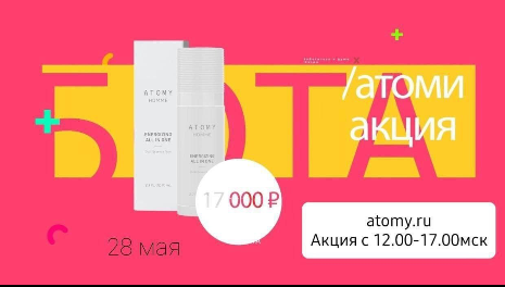 🔊 *! Акция!* 💃💥 📍Внимание , 28 мая, во время семинара будет объявлена АКЦИЯ - при покупке на сумму от 17 000 руб. в подарок🎁 вы получите Супер энергия и увлажнение для мужчин!🕺 🔥🔥🔥🔥🔥🔥 ❗Покупку надо совершить ⏰с 12.00 до 17.00 по московскому времени одним чеком.🛍️ 👉Количество чеков не ограни https://www.atomy.ru/ru/Home/Product/MallMain чено!