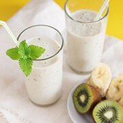 - Разлить готовый смузи по стаканам с трубочками, украсить свежей мятой.