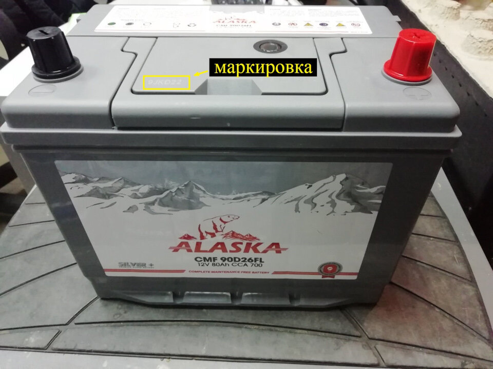 — Расшифруйте маркировку, используя справочник АККУМУЛЯТОР Alaska АККУМУЛЯТОР Alaska Чтобы узнать дату выпуска аккумулятора Аляска обратите внимание на верхнюю крышку корпуса. Заводская маркировка расположена возле ручки, между клеммами. Код состоит