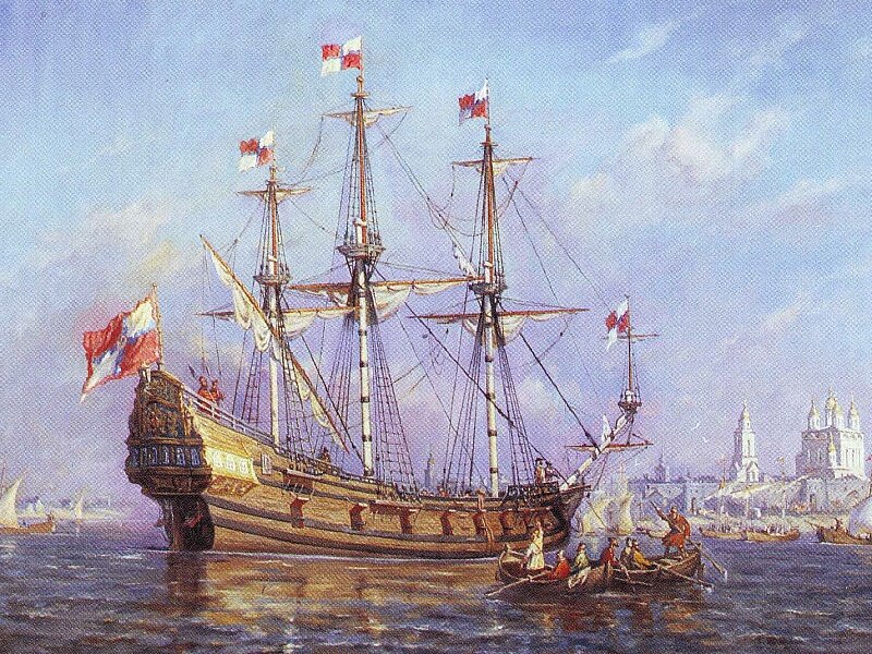 - В 1668 г., по указу царя Алексея Михайловича, русские судостроители построили на реке Оке первый крупный боевой парусный корабль - галиот «Орел». Длина "крупного" судна - 24.5 м, ширина 6.5 м. Экипаж - 22 матроса и 35 стрельцов. Это двухпалубное судно несло три мачты и было вооружено 22 пищалями. "Орёл" был первым чисто парусным военным кораблем, построенным в России. На фок- и грот-мачтах «Орла» были установлены прямые паруса, а на бизань-мачте - косой. Вот строки из указа царя Алексея Михайловича по этому кораблю: «Кораблю, который в селе Дединове сделан, прозвание дать «Орлом». Поставить на носу и корме по орлу и на знаменах нашить орлы же». Когда «Орел» был готов, на его корме и носу укрепили деревянных резных двуглавых орлов, окрашенных под золото. Эти геральдические символы царской власти являлись своеобразным подтверждением названия корабля, а затем стали традиционным украшением всех военных судов.