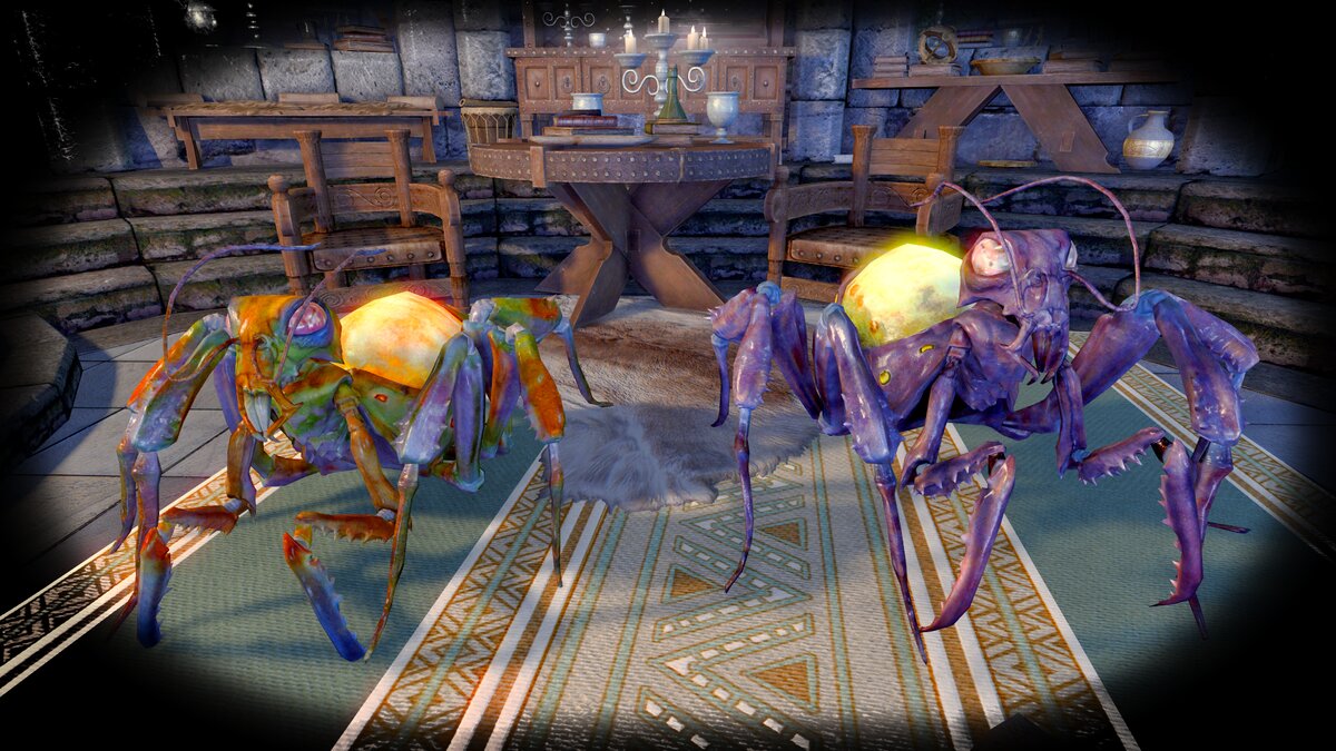 Питомцы Довакина. При прохождении квеста «Баланс силы» Довакин расправляется с бандами грабителей каджитских караванов – «золотыми святыми» и «тёмными соблазнителями». В лагерях «святых» и «соблазнителей» находятся существа, запертые в клетках – нимфы элитры из Мании и Деменции. Найдя у бандитов ключ от клетки, Довакин освобождает обоих и получает возможность взять их в питомцы. При общении с нимфами появляются диалоговые строки. Можно приказать им идти за собой, ждать здесь, помочь в бою или нести груз. К сожалению, груза они могут взять очень мало, поэтому не стоит рассчитывать на нимф как на носильщиков. Да и передвигаются они очень медленно – постоянно приходится оглядываться и ждать. Водные преграды, даже мелкие болотца, которые можно перейти вброд, им не нравятся – они начинают искать обход или же вообще встают столбом на берегу, скрипя и суча лапками. Нимфа элитры может по просьбе Довакина выдавать ему пузырёк с мистическим ядом. Помощь в бою происходит так: получив приказ
