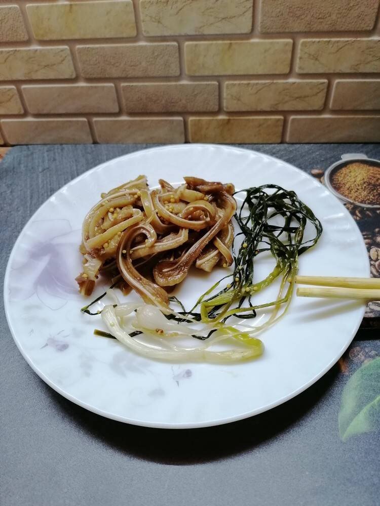 Блюдо из разряда"моя еда", потому что только я люблю такое (ещё куриные лапки и свиные почки). Вообще эти ушки готовят с большим кол-вом красного и чёрного перца, но я не люблю острое. #непп #свинныеуши #вторыеблюда #меню #закуски Ингредиенты: свиных уха, молодого чеснока, соевого соуса, дижонской зернистой горчицы, мёда Способ приготовления: Уши почистить и Отварить до готовности. Нарезать длинной соломкой в сковороду. Туда же отправляем соевый соус, мёд, горчицу и молодой чеснок. Накрываем крышкой и на небольшом огне тушим пока чеснок не обмякнет. Затем начинаем периодически помешивать, чтоб состоялось полное насыщение ушей😁. По готовности, выключаем огонь, накрываем крышкой и даём настояться ещё минут 15.