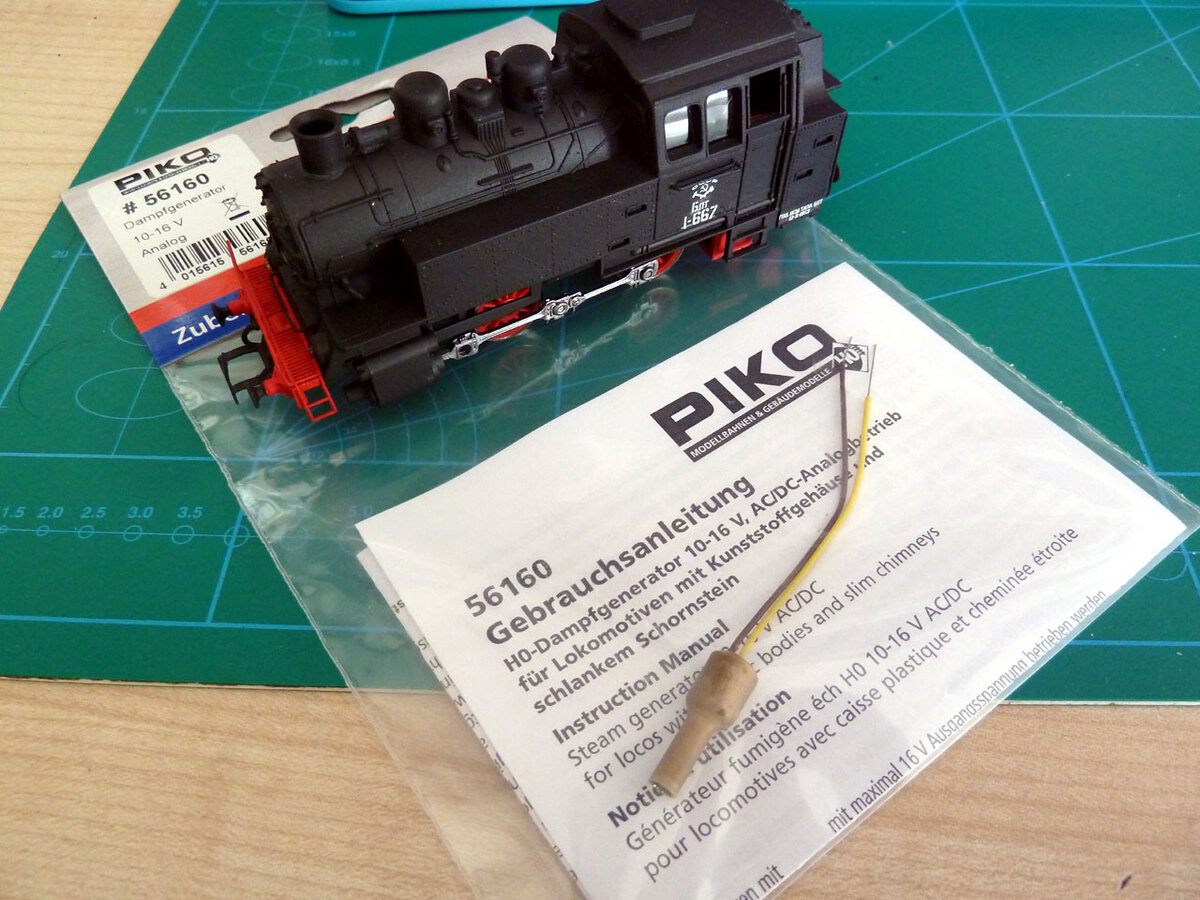 Это моя не первая работа,по восстановлению старых моделей из 70-х годов. Пришли генераторы дыма, с жидкостью и укольчиком ( не наркоманским ) для наполнения. Полчасика возни, и генератор установлен и заправлен. Модель этого Piko, за свою долгую жизнь, много где побывала. Паровозу более 30-ти лет. В какой то момент, оказалась почти на помойке. Сейчас полностью восстановлена, покрашена, добавлен свет и генератор дыма. Генератор установлен быстро, так как все было подготовлено еще в конце 2017 года, включая металлическую трубу, чтоб корпус модели не оплавился при частых поездках. Паровозик данного типа - это по играться на каждый день - так как очень прочная конструкция, минимум навесных и подвижных деталей. И в тоже время, на ходу достаточно зрелищно выглядит. Настроил модель на более менее масштабную скорость, примерно 55 км/ч. И немного моделей вагонов, моей ручной работы, сделаны под эту модель паровоза. По работе над этим паровозом. Что сделано ? : полная перекраска , установка буфе