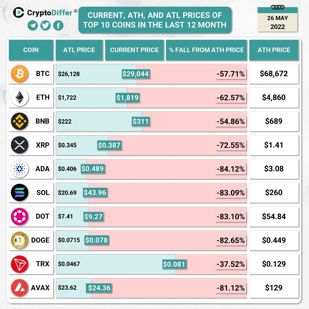 Статистика падения основных криптовалют с их ATH за последние 12 месяцев 📉
